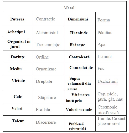 Puterea arhetipului Metal vine din capacitatea de a modela și defini. Tipurile Metal trebuie să compenseze raționalitatea, autocontrolul și meticulozitatea lor cu pasiune, spontaneitate și implicare socială.